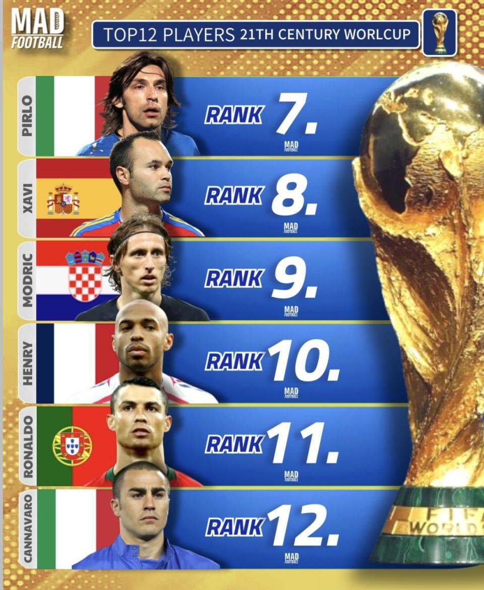 最近MAD足球整理了一份“21世纪世界杯TOP12球员”榜单,梅西排第1,齐达内、罗纳尔多、姆巴佩也都在前列。克洛泽被放到第5,亨利和C罗则落在第10、第11,这个顺序一摆出来,反差立刻就有了。更扎心的是,整份名单里几乎看不到后场位置的存在感,只有卡纳瓦罗一个人撑场。把C罗放在第11、把卡纳瓦罗放在第12,这样的排法到底算不算合理?
